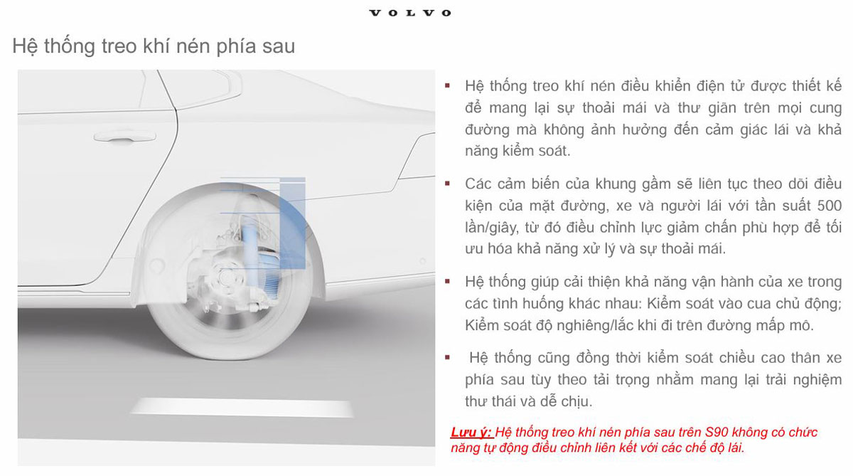 Volvo S90 Plug In Hybrid Ultra 2026 sẽ được trang bị hệ thống treo khí nén ở 02 bánh sau giúp tăng cảm giác êm ái